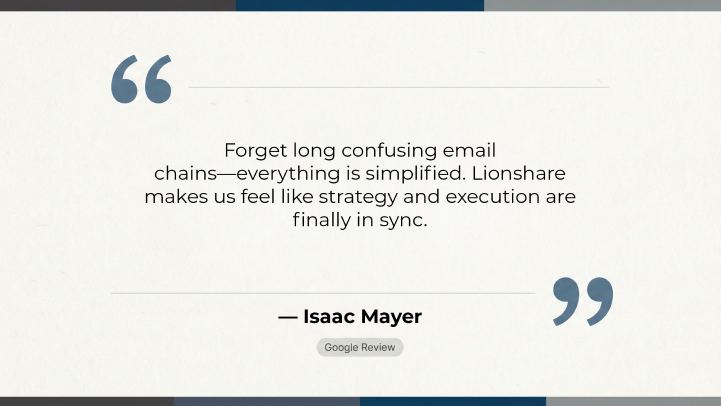 “Forget long confusing email chains—everything is simplified. Lionshare makes us feel like strategy and execution are finally in sync.” — Isaac Mayer