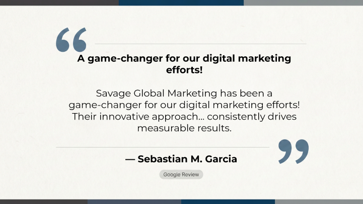 “Savage Global Marketing has been a game-changer for our digital marketing efforts! … Their innovative approach … consistently drives measurable results.” — Sebastian M. Garcia, Google review